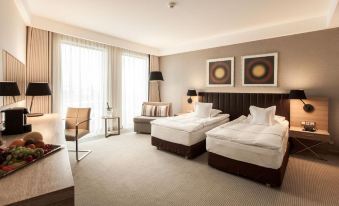 To słaby 4* hotel. Spędziliśmy tygodniowy pobyt z 1,5 rocznym dzieckiem. I chyba jeszcze nigdy się tak nie wynudziłam. Poza tym wiele oczekiwałam od hotelu z 5* tymczasem pokoje jak i obsługa pozostawiała wiele do życzenia. Pokój przestronny, ale bez możliwości otwarcia okna, można je jedynie uchylić. Klimatyzacja wyłączyła się po pierwszym dniu i dopiero w recepcji Pani poradziła żeby przytrzymać przycisk przez ponad minute( podziałało ale nie było to oczywiste). Przesuwane drzwi do łazienki i brak odpowiedniej wentylacji w łazience. Łóżko z jedna podwójna kołdrą dla 3 osób, to w ogóle absurd. Sprzątanie bardzo słabe, pościel nie zmieniana, o wymianę ręczników trzeba było prosić (nie schły same ze względu na brak wentylacji). Panie sprzątające chyba specjalnie przychodziły dokładnie wtedy, gdy byliśmy w pokoju na te 20 minut, żeby po prostu zrobić to po łebkach. W ofercie pokoju jest express do kawy i 2 kapsułki powinny być codziennie uzupełniane, niestety tak nie było. Sam teren raczej nic ciekawego tym bardziej, że nie jest on odgrodzony od deptaka wokół jeziora, gdzie wszyscy mogą wejść. Tiffilandia, super miejsce dla dzieciaków, natomiast rodzice mogą tam utknąć na cały dzień. Baseny spoko, choć momentami bywało ciasno. Obsługa dość młoda, mało doświadczona i nie na poziomie 5* hotelu. Jedzenie dość monotonne, codziennie to samo, pani robiła w kółko gumowate pancakes lub suche bajgle na ciepło. Kolacje tu polecamy dania kuchni tajskiej. Nigdy tak często nie musiałam rozmawiać z obsługa hotelową, żeby dostać to co powinno być od razu. Jedyne co mogę pochwalić to restauracja Brasserie, w której codziennie jedliśmy wspaniałe kolacje i Spa ze świetnym masażem, ale to usługi dodatkowo płatne.