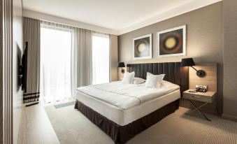 Spędziłem w tym fantastycznym miejscu październikowy weekend- więc ze względu na porę roku były to idealne warunki na relaks. Już bez wakacyjnych tłumów ale jeszcze w sprzyjających warunkach pogodowych. Obiekt jest duży i z daleka widoczny z miasta - położony idealnie nad brzegiem jeziora. Mój pokój miał z resztą widok na najdłuższe jezioro w Polsce. Sam wystrój wszystkich części obiektu emanuje nienachalną elegancją i dobrym smakiem. Dotyczy to lobby, restauracji, strefy wellnes, korytarzy i pokojów. Sam pokój jak i łazienka jest bardziej niż przestronna. Trudno chcieć więcej. Obsługa jest cały czas gotowa udzielać informacji i służyć pomocą. Śniadanie może nie oszałamia wyborem, ale też nie pozostawia wiele do życzenia. W restauracji Tiffi Braserie oprócz tradycyjnych potraw jest też reprezentowana kuchnia tajska- godna autentycznej Tajlandii. Na dodatek jako gościowi indywidualnemu przysługiwał check-out dopiero o 18.00 bez żadnej dopłaty- jedynie szkoda że nie wiedziałem o tym przed przyjazdem- to prawdziwe królewski gest ze strony hotelu.