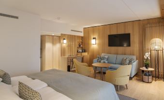 A nice contemporary building of an agradable architecture, surrounded by 100 Ha of land and lawn on the shores of Lake Maggiore. The setting is impressive. The quality of the buildings typical Swiss. We had a suite in the wellness pavilion 100m2 with a huge terrace facing the park. Everything oversized, bathroom, closet, etc extremely comfortable and large. Very comfortable beds with linen bed sheets. Very nice sand beach and enormous pool and Spa. The 2 restaurants plus the lunch garden buffet spot are great. Very good food and service. Staff perfectly trained and kind. Shuttle service to Ascona town allows easy visiting. A remarkable hotel, very Swiss and a heaven of peace.