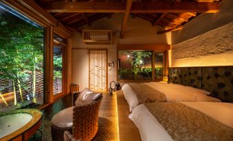 I have been experiencing ryokans in Japan for many years and Takefue is the best all around in my opinion. It’s nestled in a beautiful bamboo forest with access to rooms and baths by way of winding covered wooden walkways. Our room was modern yet faithful to ryokan tradition. Both indoor and outdoor baths you can enjoy without leaving your room. The bathroom has all the toiletries you need including luxury name brand products. Large bedroom with comfy beds and bathrobes. Soft drinks in the refrigerator are included as well as fresh coffee. The in room dining is in the same league as the finest restaurants and we enjoyed a wonderful omakase meal one night and sukiyaki our second night. The seafood was incredibly fresh including the best uni I think I’ve ever had! Taka san kept us well looked after and has the astounding ability to anticipate every need from the time he picked us up until we were dropped of. The service he provided was absolutely outstanding in every way. We enjoyed two of the property’s hot springs, which are reserved in 45 minute periods. Soaking under the bamboo forest with the sounds of birds and insects is unforgettable. In addition there was live music at night and we enjoyed it very much sitting on our patio. The tasty parting gift was also very much appreciated (and thoroughly enjoyed). I could continue at length about how much we enjoyed our stay but I will end by suggesting that if you are considering a ryokan getaway, then take it from an experienced ryokan aficionado and reserve at Takefue!