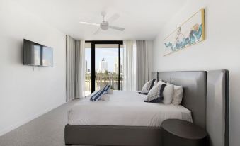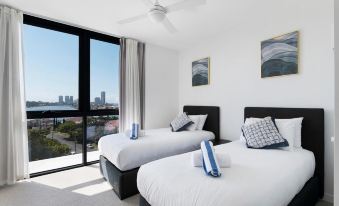 Stunning views from a luxurious apartment. We were on the 5th floor. Walking distance to Surfers and also local cafes and tavern. Some simple changes would make a huge difference. Not able to zip single beds into queens. No towel rails or soap holders etc in the showers. No bedside lamps. Would stay again despite these issues. 4 bathrooms a plus.