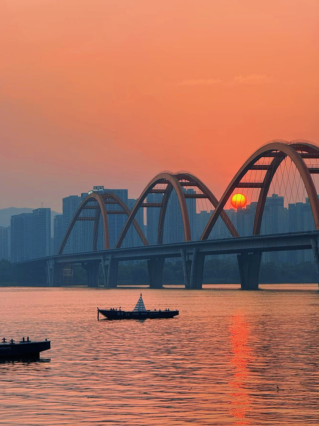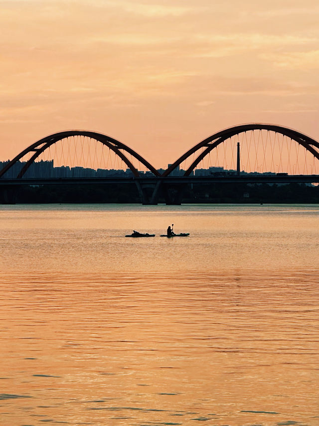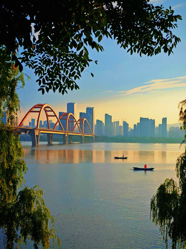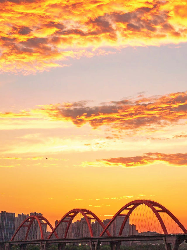 The sunset melts like gold, the evening clouds merge like a jade disk, and the red arches of Fuyuan Road Bridge outline the most captivating silhouette of Changsha in the afterglow. 📸 Standing on the east bank of Fuyuan Road Bridge, the sunset’s afterglow spills over the surface of the Xiang River, the shimmering water seemingly coated in gold. The red basket-handle bridge spans the Xiang River, glowing crystal clear under the sunset, harmonizing with the newly lit city lights. This place is not only a popular check-in spot but also a window to touch the millennium-old cultural heritage of Changsha. The Xiang River, the historic river that nurtured the Huxiang civilization, reveals its gentlest side here. --- 01 Dialogue Between Bridge and River 🌉 The Visual Charm of Fuyuan Road Bridge • Fuyuan Road Bridge is currently the widest bridge deck among the Xiang River bridges in Changsha. Its unique design of three red basket-handle bridge spans makes it the most eye-catching scenery on the Xiang River. • Driving across the bridge feels like passing through a rainbow, with smooth and powerful lines resembling a giant dragon on the Xiang River. • Known by netizens as "the bridge you’d take a detour to cross," it is not only a city landmark but also a must-visit summer photo spot for tourists. • At dusk, colorful tents spread across the lawns along the Xiang River scenic belt on both sides of the bridge, where people enjoy their wonderful time. 02 Golden Hour 📸 The Stunning Photo Spot Under the Bridge • The best time for photography here is from 5 PM to 7 PM. The soft sunset dyes the river orange-red, complementing the red bridge and creating breathtaking scenes. • To capture the perfect sunset, it’s recommended to arrive half an hour before sunset. In summer, this usually occurs between 6:30 PM and 7:00 PM, when warm orange hues paint the entire sky. • Looking from the east bank of the bridge, the opposite shore is Hunan’s Riverside Financial Center, where skyscrapers and the shimmering Xiang River form a modern backdrop. • Using perspective tricks, you can take fun photos; the river breeze lifting hair and clothes adds vividness to the pictures. 03 City Lights Rise 🌃 An Excellent Spot for Night Photography • When night falls and the bridge lights turn on, the bridge becomes a sea of lights. The three large basket-handle lines flicker with lights, reflecting on the river like a colorful ribbon flowing across the Xiang River. • Long exposure shots at this time can capture the light trails of traffic combined perfectly with the dazzling bridge lights. • Around 7:30 PM, the sky is not completely dark yet, but city lights are already on, making it the golden hour for blue hour photography. • Citizens relaxing and drinking tea under the bridge add a sense of life to the scene, showcasing the unique romance and comfort of Changsha people. 04 Millennium Xiang River 🏮 Flowing Historical Heritage • The Xiang River runs from south to north through Changsha’s urban area, witnessing the city’s thousand-year changes. According to the Qing Dynasty Tongzhi edition of the Changsha County Gazetteer, historically, the Xiang River ferry crossings were divided into official and voluntary ferries. • Since the 13th year of the Jiaqing reign (1808), the government promoted the construction of voluntary ferries, with many donating land and property. Stone steps, docks, and river god temples were built on both banks and the water-land islets. • The voluntary ferry pavilion on the water-land islet bears an anonymous couplet: “The voluntary ferry has a pavilion, viewing the scenery on both banks of the Xiang River, with rolling torrents and thousand-layer waves; the merciful ferry has no master, aiding all merchants and travelers in Changsha, with a vast sea of people and a hundred bridges.” • In 2010, the Changsha Institute of Cultural Relics and Archaeology discovered a 200-meter-long ancient Xiang River embankment relic in the Wanda Plaza area of Kaifu District, preliminarily dated to the late Tang and Five Dynasties period. 05 City Memories 🏞️ Cultural Resonance of Xiang River and Changsha • The Xiang River is not just a geographical river but the cradle of Huxiang culture. In the northern section of the Xiang River within Wangcheng, ancient towns such as Jinggang, Qiaokou, Xinkang, Tongguan, and Shutang are scattered. • These ancient towns each have unique characteristics and once flourished historically, with the saying, “A cluster of ancient towns along the Xiang River represents half of Huxiang cultural history.” • Today, both banks of the Xiang River have become an essential part of life for Changsha residents. The riverbanks from Sanchaji Bridge to Fuyuan Road Bridge are popular areas. • The east bank offers stunning sunsets, while the west bank has winding paths perfect for photography. Every evening, citizens come to the riverbank to cool off, relax, and take photos. --- As city lights rise, the lights of Fuyuan Road Bridge turn on, like a colorful ribbon flowing across the Xiang River. The river breeze blows, the lights of the skyscrapers on the opposite shore flicker, and the bridge’s reflection in the dusk creates a charming scene on the river. The romance of Changsha lies both in the millennium flow of the Xiang River and in the sunset glow on Fuyuan Road Bridge. ✨ Bring your camera to capture these moments of light and shadow, and don’t forget to feel the cultural pulse of this city with your heart. 📷💫