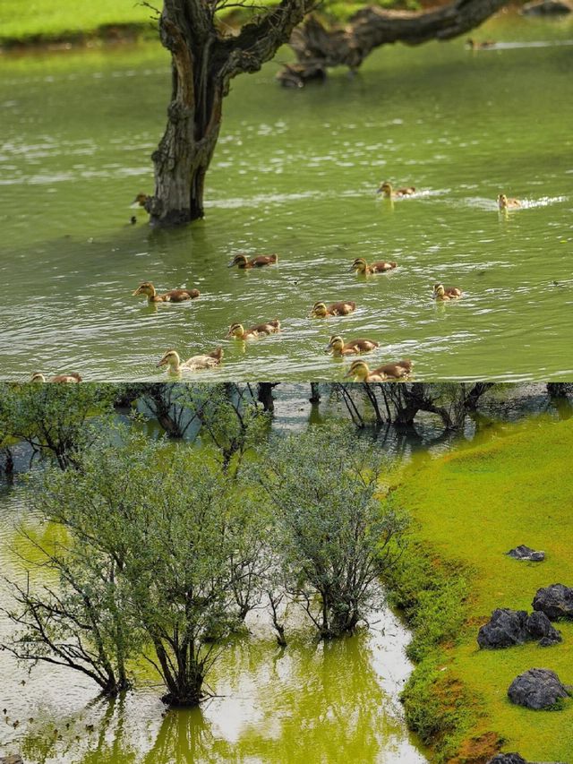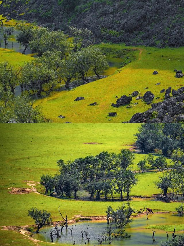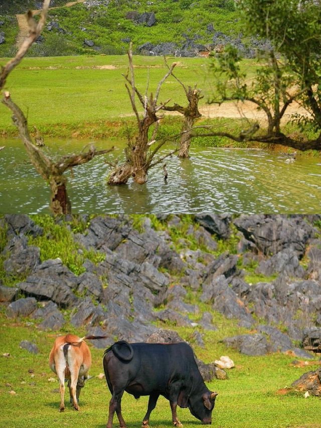 Such a treasure || Xinjiang Altay has been very popular recently, with vast grasslands and cattle and sheep everywhere But in fact, there is such a place in Baise, Guangxi. It is really healing. Today I will show you this "Little Xinjiang" [Longkalai] · 📍Location: [Longkalai], Debao County, Baise, Guangxi, direct navigation 🎫Tickets: No tickets are required. No one is currently guarding 🚄Transportation: After the high-speed rail arrives at Baise Station, it takes an hour and a half to get there by renting a car. The whole journey is relatively easy to travel. There is a parking lot near the scenic spot, which is only a five-minute walk away. · 【Photography Tips】 ❶ Park your car in the parking lot, walk uphill and you will see the "Qinglong Lake" sign, and then look down to see the cover. You can cross the stream and keep going forward. You will encounter many cattle on the road. This is where the locals usually graze their cattle. ❷There are many small fish and ducks in the lake. It is very primitive and secluded. I went there on April 29th and there was no one there. ❸ For taking photos, the effect is better between 3-5 pm. You can see the whole picture with a drone. You can take a more complete picture by standing at the entrance and shooting downwards. If you take pictures from below, the layering is not so obvious, but you can take pictures with the little animals. Finally, remember to take away all the garbage when you leave to protect the environment⚠️