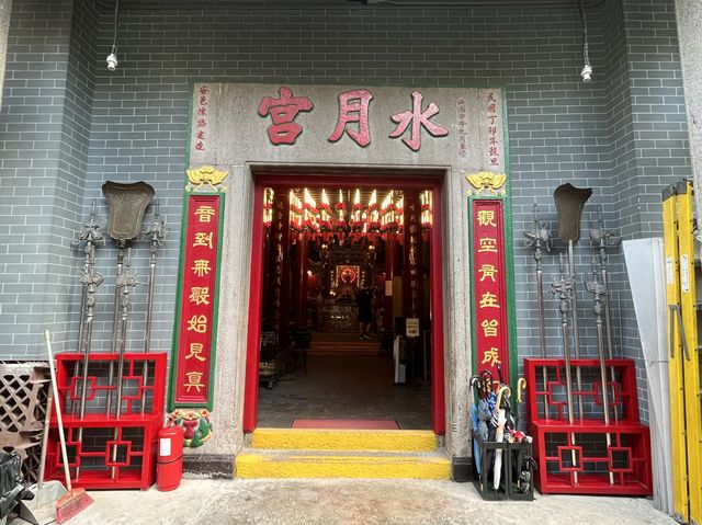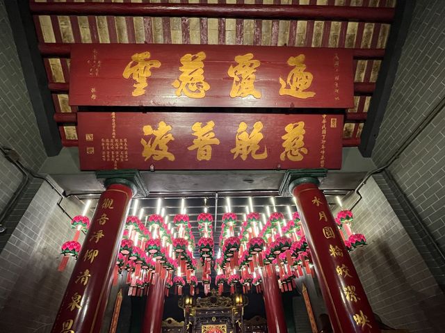 Dashigu Guanyin Temple, also known as Shandong Street Shuiyue Palace, Dashigu Temple or Dashigu Shuiyue Palace, is located at 90 Shandong Street, Mong Kok, Kowloon, opposite the MacPherson Stadium. It is a Grade III historic building in Hong Kong, surrounded by high-rise buildings, with traditional Chinese design, red walls and green tile roofs. Shuiyue Palace has a two-in-three-bay structure, with a government office and a college on both sides. On the stone door of the main hall is engraved the couplet "When you look at the void, all existence and everything are illusions. Only when the sound reaches silence can you see the truth." The main hall is dedicated to Guanyin, and there are couplets on both sides of the shrine: "Avalokitesvara is in the purple bamboo forest, and Tathagata is seen on the red lotus seat." To the left and right of the Guanyin statue are accompanying gods such as Bao Gong, Wong Tai Sin and Dragon Mother. The side halls on the left and right were once used as academies and public offices, and housed the Ksitigarbha Bodhisattva Hall and the Tathagata Buddha Hall. The temple houses a number of precious cultural relics, such as two antique plaques dating back to 1927, a Guanyin bronze fan, an incense table, and lotus lanterns for believers to pray for blessings. #Mongkok Attractions #Dashigu Guanyin Temple #Shandong Street Shuiyue Palace