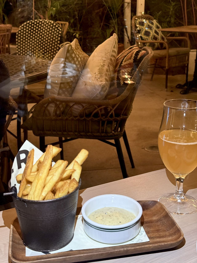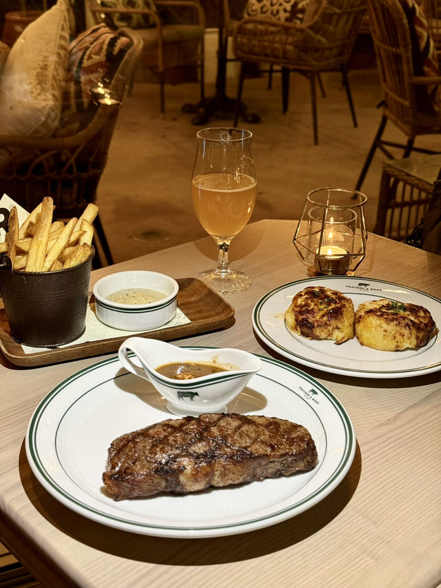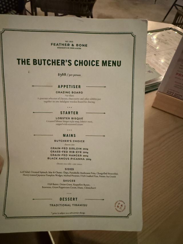 Away from the city, we found a peaceful Western restaurant in Clear Water Bay, Sai Kung 😌 The restaurant has both outdoor and indoor seating, equally chill! We enjoyed a wonderful evening😍 We ordered the Butcher's Choice Set, which offers 4 types of steak to choose from. We picked two different ones to try 🥩 I chose the Sirloin with Chips (Peppercorn Cream) and the Black Angus Picanha with Potato au Gratin (Onion Gravy). The sirloin steak was cooked just right, tender and juicy, paired with the rich green peppercorn cream, truly flavorful! The fries were golden and crispy. The Black Angus Picanha with baked potato was also excellent, full of beefy flavor, complemented by the rich onion gravy, very delicious 😋 The set also included a Grazing Board, featuring a variety of cheeses, cold cuts, and other snacks, with generous portions perfect for sharing with friends. The lobster soup was rich and full of seafood freshness. The dessert, Tiramisu, was also well made, with a strong coffee flavor and smooth texture, a perfect ending to the meal. For drinks, I ordered a glass of apple juice, refreshing and thirst-quenching. My friend had a Heaps Normal 0% XPA, a non-alcoholic beer, but it tasted pretty good, perfect for friends who are driving. Overall, this restaurant has a comfortable environment, high-quality food, and great service. It’s definitely a great place to escape the hustle and bustle and enjoy good food. We will definitely come back to try other dishes! Also, the restaurant is on the ground floor, and the retail space on the first floor sells ingredients you can buy to take home! 📍Feather & Bone Bar & Grill Shop 1, Ground Floor, Ao Lung Retail Building, 663 Clear Water Bay Road, Sai Kung Food Food out lover r