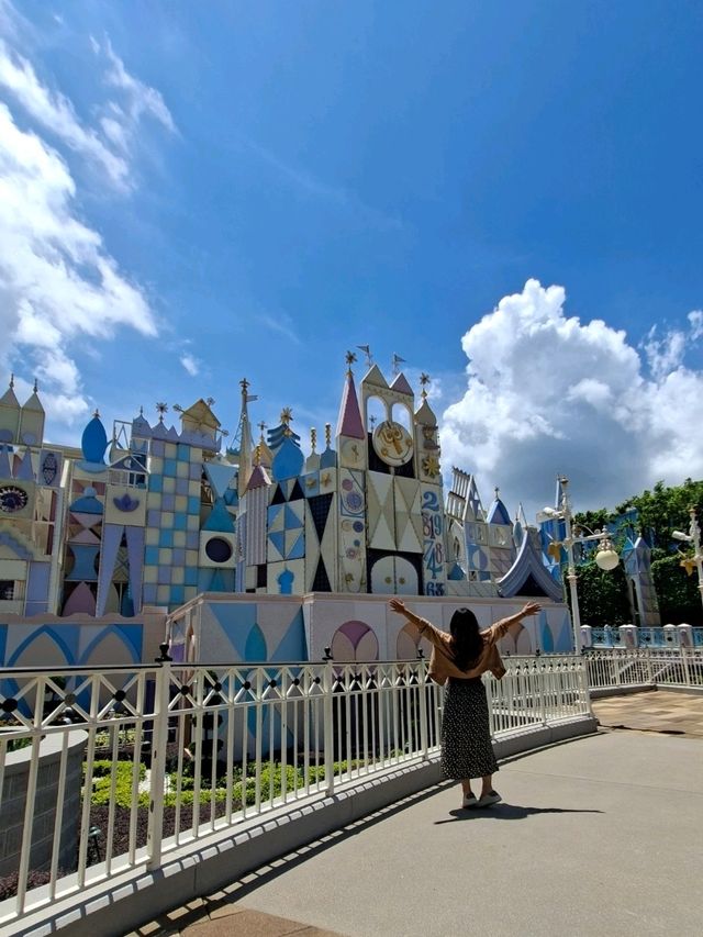 “It’s a Small World” at Hong Kong Disneyland is one of the cutest rides you shouldn’t miss. It’s adorable from the pastel-colored castle decorated with sweets. When you walk inside to board the boat, it feels like you’re a player in Squid Game or something like that 😁 💫 Sailing through a dream world filled with cute dolls from various countries dressed in traditional costumes singing “It’s a Small World” in different languages. The interior is decorated with bright colors and sparkling lights, creating a very dazzling atmosphere. It’s cool and comfortable inside with no thrills, but it helps cool you down and gives you a break from the excitement and scares of other rides. It takes about 10 minutes, and there’s a photo spot inside, so don’t forget to smile for the camera 😄