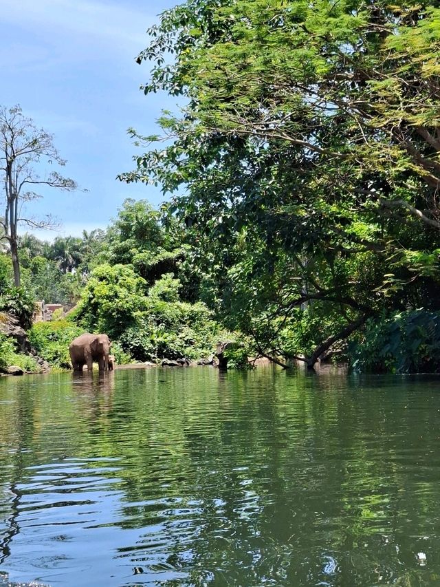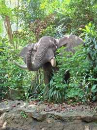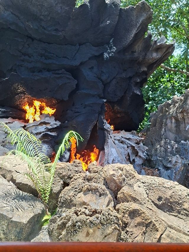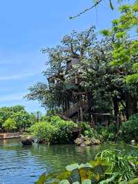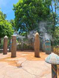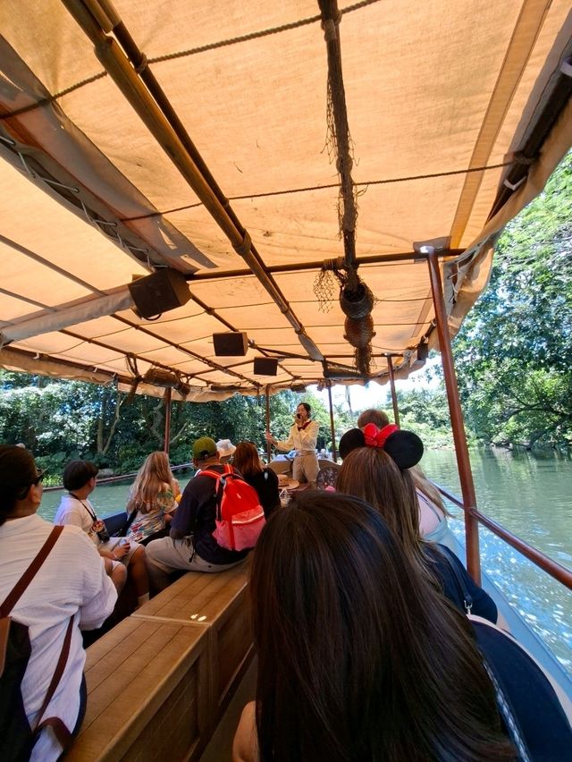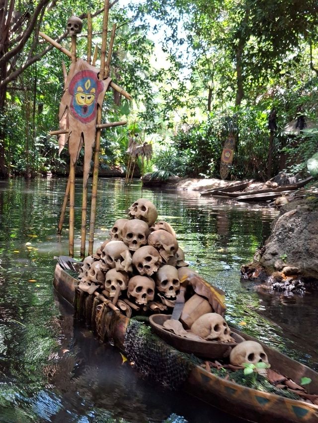 🏞 Adventureland in Hong Kong Disneyland is another place where we can escape the heat and find some cool relief 😆 because here we get to board a boat and cruise along the river, feeling as if we've entered a tropical jungle filled with fun and the thrill of adventure. In this zone, Tarzan’s Treehouse stands out in the middle of the island, but it seemed to be closed on the day we visited, so we didn’t stop by, just pointed it out. However, the Jungle River Cruise, a safari-style nature boat ride, offers a different kind of exciting experience. Along the way, wild animals pop out to surprise us, and at some points, there are jungle people and jungle sounds. Most importantly, there’s the captain’s laughter too, as he tells jokes and acts very skillfully 😆. During the cruise, there’s a highlight: "the clash between the gods of fire and water," which is thrilling and spectacular.