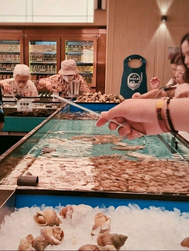 Qianhai Aquatic Products is a popular all-you-can-catch Hong Kong-style seafood hotpot restaurant in Tsuen Wan Plaza, specializing in a "catch and cook" experience. A large tank houses a wide variety of live seafood, including abalone, shrimp, crab, and clams, all available for all-you-can-catch, cleaned and prepared by the staff. A wide selection of hotpot broths is available, including the nourishing Golden Broth Fish Maw and Chicken Hot Pot, complemented by premium ingredients such as Australian Wagyu beef, American beef shoulder, and foie gras toast. The buffet area offers a wide selection of desserts, drinks, cooked food, and ice cream. Visiting during lunchtime, from 12:00 PM to 3:00 PM, is recommended for optimal value, allowing you to enjoy a full three-hour meal.