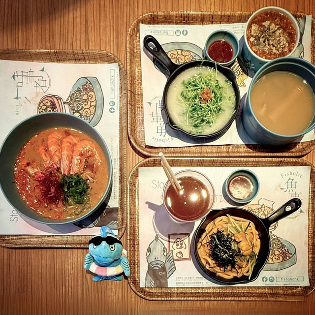 Today, I went out for a delicious meal with my dad again! This time, we went to a lovely restaurant with a Michelin halo. We're talking about Fisholichk, a small restaurant that has been awarded the Bib Gourmand in the Hong Kong and Macau Michelin Guide for three consecutive years! We chose the branch located in the Food Court on the 11th floor of Hysan Place in Causeway Bay. For the restaurant's fifth anniversary, they're offering many promotions and a brand new menu. From October 13th to 26th, they're also offering a limited-time 25% off discount—a great deal! From October 13th to 26th, spend $200 or more and follow Fisholichk's official Instagram account (@fisholichk) to receive a limited-edition fish-masked figurine charm (limited supply, while supplies last). Also, from October 27th to November 9th, spend $500 or more on the official website to get 50% off (excluding shipping). Bookmark to take advantage of this offer! For a drink, I chose the frozen Brain Thin Halo with Tangerine Peel and Lemon (original price $25, $10 with a side dish). It's said to be good for both health and wellness, and it's sweet and delicious. Dad ordered the frozen Signature Milk Tea King (original price $20, $7 with a side dish). Fish Soup with Fish Maw, Conch, and Bamboo Fungus (original price $58)! The broth is incredibly rich, boasting not only the savory flavors of the fish broth but also the rich flavors of the conch and mushrooms. The generous portion is more than enough for us to share. Fish Ramen in Bowl $28! This Hong Kong street food, infused with fish, also delighted Dad. The noodles are sprinkled with crispy fried fish skin, adding a nice texture. The consistency is just right, smooth and flavorful. This bowl of fish ramen is truly impressive. Fish Ramen in Shrimp ... The vibrant orange-red roasted bone and rich shrimp broth are incredibly fragrant and delicious, complementing the springy fish ramen with a truly high-quality texture. The fresh, sweet prawns add a touch of umami to the mix, truly delicious. Hokkaido Sea Urchin Fish Udon $88! Highly recommended for sea urchin lovers, the use of Hokkaido sea urchin in the slippery fish udon creates a truly captivating slippery texture and sweet flavor. Both new noodle dishes are available until November 24th. Jade Sprouts in Fish Broth $23! It's incredibly delicious without even a hint of herbaceous flavor. The jade sprouts are filled with the aroma of the fish broth, complemented by a hint of garlic and a sweet and delicious flavor. I really love the restaurant's approach to food, infusing familiar dishes with fish elements. Their creativity and surprises are both invaluable, and their meticulous preparation truly deserves Michelin recognition.