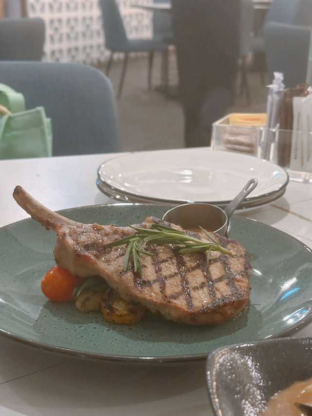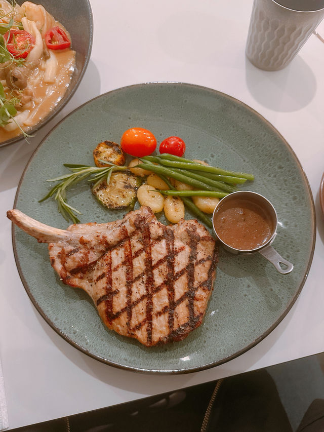 Visited the popular Western restaurant "NON KITCHEN" in Kwun Tong for dinner tonight 🌙 . Charcoal Grilled American Pork Chop 🥩 The pork chop is thick, tender, and juicy 🤤 with a smoky charcoal flavor 🔥, served with cherry tomatoes, asparagus, zucchini, and potato gnocchi 🥔. Seafood Udon in Lobster Sauce 🍝 The udon is topped with prawns 🦐, mussels, clams 🐚, squid 🦑, and mushrooms 🍄🟫. The lobster sauce is rich and flavorful 🦞, perfectly coating the chewy udon 😗. Yogurt Cucumber Salad 🥬 Includes cucumber 🥒, red kidney beans 🫘, carrots 🥕, mixed with yogurt and balsamic vinegar dressing 🤍. Caesar Salad 🥗 Tomato Soup 🍅 Bread Rolls (2 servings) 🥖 Molten Cheesecake 🍰 The cake's outer layer is baked to a slight crisp 😆, while the inside is soft 😌 with a molten yogurt cheese filling 🧀. Tiramisu 🧁 Hot Black Coffee ☕️ Hot Milk Tea 🫖 NON KITCHEN Address: 📍1/F, Cotton Factory Building, 12 Hung To Road, Kwun Tong