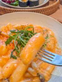 THE SOUTHSIDE, which opened in 2024, is located in Wong Chuk Hang, Southern Hong Kong Island. Have been to both restaurants before and recently went to try the others. Terrace in seaside is a restaurant serving Korean-style Western cuisine. The decor features wooden elements and earth tones to create a natural and comfortable dining environment. One-person set from HKD 82 including one drink of your choice. Limited drinks require an additional charge. 🍊Mingtai Cream Rice Cake (HKD 92) The saltiness is full and very tasty, but after eating about half of it, I felt it was too salty. The taste of the year cake will be soft and glutinous, and there are mushrooms to increase the taste. ✨Traditional Rice Roll (HKD 82) The presentation is good, the taste is just normal, with a little sesame oil fragrance. 🍊Citrus Cheese (+HKD 28) It looks quite interesting, but when the citrus accidentally falls into the cup will spill the drink Orz The taste is fruity plus slightly sour, full of refreshing cup. There is no additional charge for specialty drinks such as tea. As far as photography is concerned, this meal would be good. But the price is quite expensive. 。 。 Terrace in seaside 📍Address: Shop 203, 2/F, THE SOUTHSIDE, 11 Hong Yip Road, Wong Chuk Hang ⏰Business Hours: 11:30 - 22:00