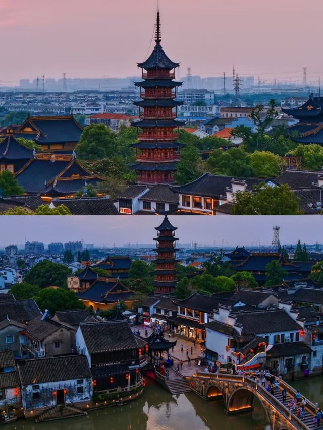 1, 2: These are the most photogenic shots of Qiandeng Ancient Town, the classic Qinfeng Tower. 3: Using a 3x zoom to shoot from the same angle, the sense of compression is even stronger. 4: The small bridges and flowing water common in ancient towns, especially capturing the boat in the middle of the river, create a very artistic and relaxing wallpaper. ❤️🧡: Dedicated to those who live in Qiandeng Ancient Town or appear in the photos; especially to those who have checked in at Qiandeng, making the visit vividly come alive on your phone screen. Beautiful Shanghai priority location: wallpaper from an aerial drone perspective