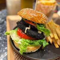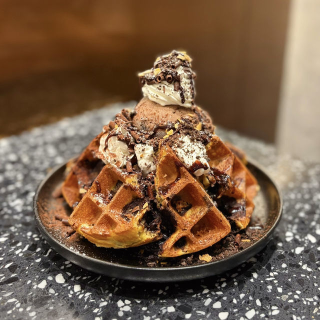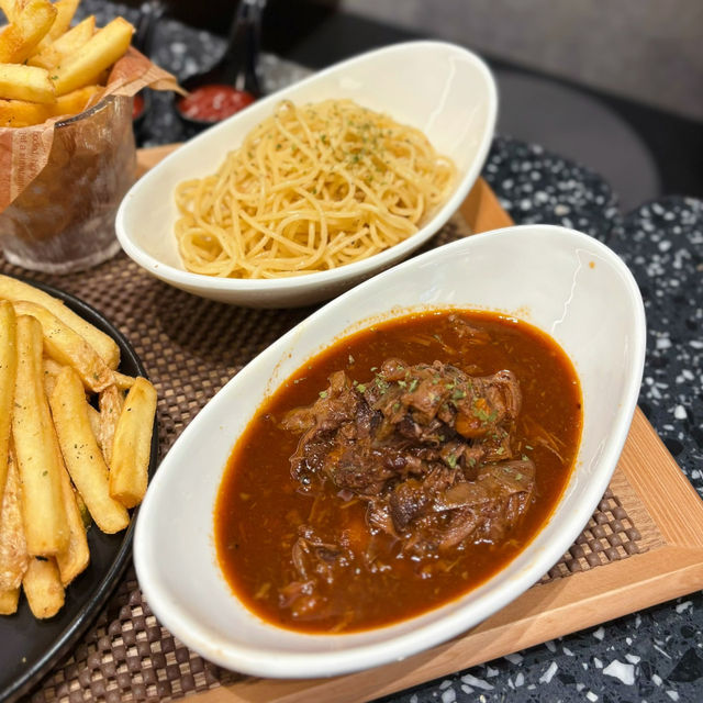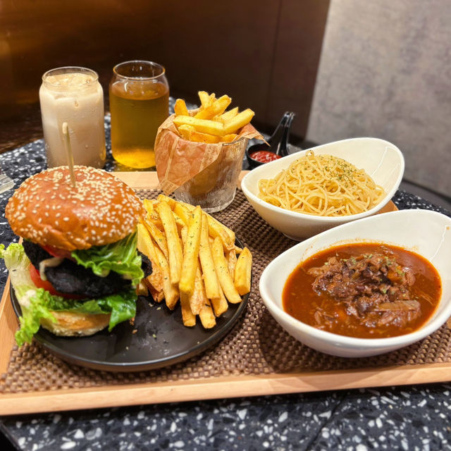 I previously visited @blackcoffeehk's Mong Kok store and thought it was pretty good, so this time I came to try their Kwun Tong branch 🤩🤩 The cafe focuses on light meals, coffee, and desserts, with a wide variety of food options. The interior is comfortable, decorated mainly in black 🖤, giving a spacious feel!! - 🍔 Homemade Fried Black Charcoal Bun Pork Chop Burger with Mixed Vegetable Salad $98✨ Looks very appealing! The pork chop is wrapped in a black charcoal bun and then fried, making it especially crispy and juicy 🤤🤤 For an extra $22, you can swap the mixed vegetable salad for fries 🍟. The fries are crispy and flavorful, and the portion is generous~~ - 🍝 Slow-cooked Beef Cheek with Garlic Fried Spaghetti and Mixed Vegetable Salad $139✨ The beef cheek is tender and flavorful, the spaghetti is stir-fried dry with a strong garlic aroma! Paired with a rich sauce, it’s very appetizing 😋😋 - 🍫 Triple Chocolate Waffle (whole) with Chocolate Ice Cream $98✨ The waffle is made to order, crispy on the outside and soft inside~ topped with plenty of chocolate sauce and chocolate ice cream 🍫, very indulgent!! - For drinks, we chose Brown Sugar Roasted Tea Fresh Milk ($48) and Apple Juice ($44)~~ The Brown Sugar Roasted Tea Fresh Milk is smooth and rich with the flavors of brown sugar and roasted tea in every sip! The sweetness is just right, quite good 👍🏻👍🏻 - 🏠 Black Coffee Address: Shop 201, 2/F, YM², 33 Hip Wo Street, Kwun Tong Opening Hours: 10:00 - 20:00 hk