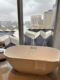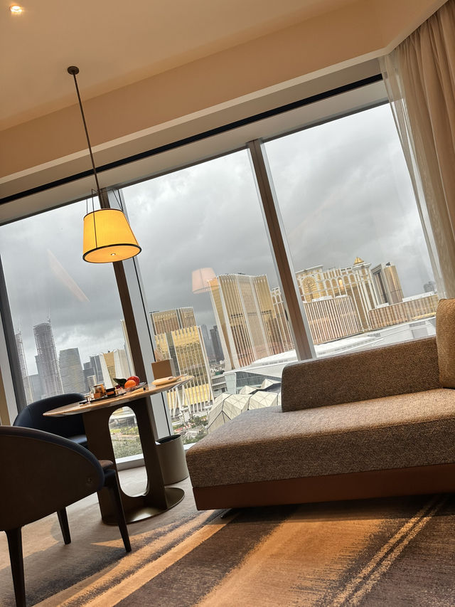 It was my first time staying in such a high-end hotel. The front desk staff personally escorted me to the room and introduced the in-room facilities. There's a smart assistant, the room is incredibly spacious and comfortable, and there's even a complimentary snack bar. You can replenish the snacks after finishing them, and even the beer is free to enjoy and can be refilled. Macau beer is absolutely delicious! Plus, you can enjoy stunning views. How could anyone miss such a premium hotel?