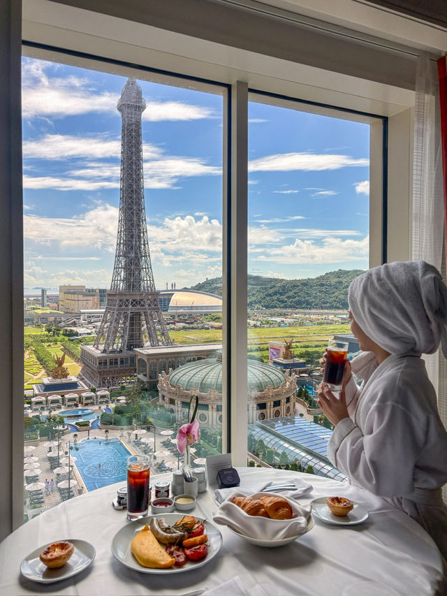 #TravelGuide ⭐️Location: The Parisian Hotel Macau (Lote 3, Strip, SAR, P.R. China, East Istmo, Macau) 🍯Information: ✔️Highly recommended for the breathtaking view from the room✨ ✔️Great pool with a panoramic view of the Eiffel Tower🙌🏻 ✔️The staff are very friendly, and they even prepare cake for special occasions🎂 ✔️Breakfast is available via room service🙌🏻