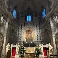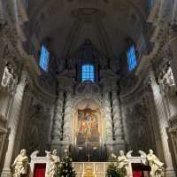 The Teatro di San Carlo is a baroque-style church in Italy, modeled after Sant'Andrea della Valle in Rome, designed by Italian architect Agostino Barelli. In 1690, his successor Enrico Zuccalli added a pair of 71-meter-high dome towers outside the original plan. The Rococo-style facade was not completed until 1768 by Francesco de Sanctis. Its Mediterranean appearance and yellow color have become famous symbols of the city and have had a great influence on Baroque architecture in southern Germany.
