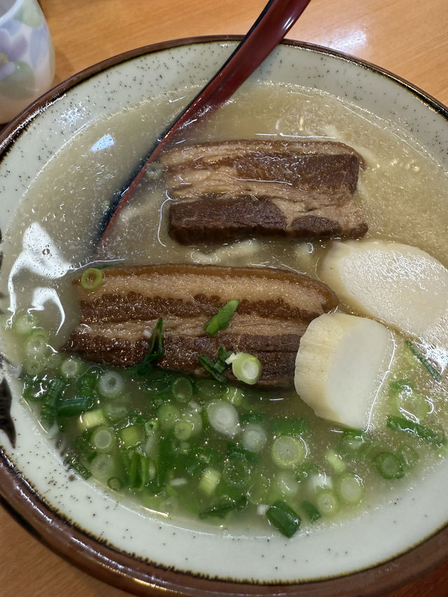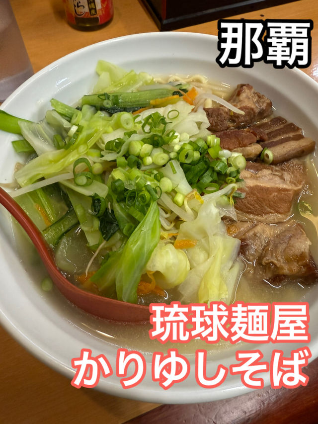 Ryukyu Menya Kariyushi Soba in Naha City This Okinawa soba restaurant is located between Asahibashi Station on the Yui Rail and Kencho-mae Station, in an area with many hotels nearby. While many Okinawa soba restaurants have short business hours and only serve lunch, this one is open from 6:00 PM to 1:00 AM. It's the perfect place for dinner, as well as a post-drinking treat. This time, we visited as a couple and ordered the sanmainiku soba and the meat and vegetable soba. The slightly cloudy soup was light despite its appearance, making it a perfect after-drinks treat. The curly noodles also had the characteristic Okinawa soba texture and smooth texture. The sanmainiku had a savory, sweet flavor from the fat, which was a nice accent to the light soup. The meat and vegetable soba was a hearty bowl full of sanmainiku, cartilage pork ribs, and boiled vegetables. This Okinawa soba restaurant is close to the station and open late into the night, making it a popular choice for tourists and business travelers alike. Address: 1-1-1 Kume, Naha City, Okinawa Prefecture, 900-0033 Average Price: ¥1,000 Rating: ⭐️⭐️⭐️ (3 stars) #Naha #Okinawa #OkinawaSoba
