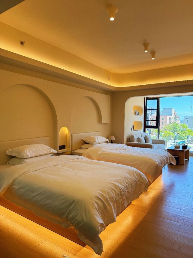 Traveling to Nan'ao Island in the off-season and staying at this guesthouse is just too perfect! It’s really so comfortable 🌴 ✅ Huge floor-to-ceiling windows with an amazing view, directly enjoying Nan'ao Island’s blue hour✨ ✅ Whole house smart control with Xiaodu for lights/air conditioning/curtains, plus music and news; memory foam pillows like Atour’s for a good sleep, Chaoshan kung fu tea set + Dancong tea bags provided, complete toiletries and disinfectant wipes ✅ Thoughtful service to the max: sanitary pads, hair ties, dental floss—just ask the front desk if you need anything; public washing machine + disinfectant tablets super convenient ✅ Worried about getting lost? The host will come downstairs to pick you up~ ✅ 2-minute walk to the Tropic of Cancer Square, close to the beach! Mall downstairs + Qing'ao Bay food street, endless snacks to try 🍜, convenient public transportation ✅ Wide range of room types: family-friendly dolphin/SpongeBob/zoo-themed fun rooms; couples can choose leisure bathtub king rooms; friends can stay in cozy tea lounge twin rooms; families can book 2-bedroom 1-living room gathering rooms, all super comfortable 🏠 Name: Nan'ao Island Sanhai Resident Guesthouse (Qing'ao Bay Branch) 📍 Address: 3rd Floor, Building 1, Haishang Dongfang Plaza, No. 11 Haiwan Road, Qing'ao Management Committee, Nan'ao