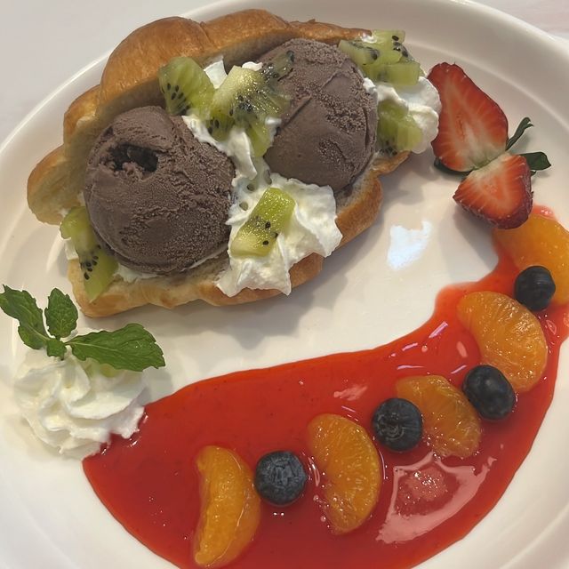 It is both a hotel and a cafe in one. The place is very beautiful. There are many photo spots. The owner is very friendly. There are many food options and many desserts. I recommend the croissant ice cream. The croissant has a delicious buttery aroma. It is not too sweet. The sauce that is served is not too sour. It is considered perfect. We can walk and take pictures all over the area. The pool is very beautiful. The cafe is also close to other amenities. You can't miss it. #Go to a chic cafe #Visit Phuket