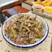 Located near Mong Kok East Station, this place boasts a hipster-inspired decor with a retro American feel. They offer a variety of American and Japanese dishes, like matcha tea. The food is filling and flavorful, and they're pet-friendly! 👍 Chill To Cheese Beef Burger with Fries | $168 | 8/10 The beef patty is incredibly thick and tender. Besides the melted cheese sandwiched between the burger itself, there's also a bowl of cheese sauce. I always slather it with cheese! 🤣 Truly Chill To Cheese! Black Truffle and Mushroom Penne | $118 | 7.5/10 The black truffle flavor was very rich, and the mushrooms were generous. The penne had a smoky, chewy texture; I prefer it softer. Fried Chicken Wings (Garlic Butter Flavor) | $68 | 8/10 The garlic flavor was incredibly strong, and the bone-in chicken wings were fried to a crispy, chewy texture. Banana Oreo Crumble Milkshake | $55 | 7.5/10 A classic American Oreo flavor, not too overpowering with the banana flavor. While it's a bit sweet at the end, I still wanted more Oreo crumbs. Uji Koyamaen Matcha Fresh Milk | $50 | 8.5/10 For an extra $5, I switched to oat milk. The matcha flavor was rich, smooth, and not overly sweet. #localtravel #foodie #HongKongDeals