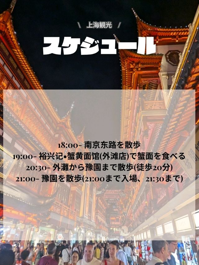 #0YenTravel2025Autumn 🐼 \ Must-See for Travelers / Shanghai at Night 📍Shanghai, China How to Enjoy Shanghai at Night! -- 🟠Schedule 6:00 PM - Stroll along East Nanjing Road 7:00 PM - Eat crab noodles at Yuxingji • Xiehuang Mianguan (Bund Branch) 8:30 PM - Stroll from the Bund to Yuyuan Garden (20-minute walk) 9:00 PM - Stroll through Yuyuan Garden (entry until 9:00 PM, closing at 9:30 PM) 🟠 East Nanjing Road A gigantic shopping street. Souvenir shops galore. Crab noodles are located near East Nanjing Road, so we recommend strolling around before dinner. 🟠 Crab noodles Enjoy delicious crab noodles at a famous crab noodle restaurant! I recommend the Bund or Yuyuan Garden locations. Reservations are accepted, but you can get in if you wait in line. 🟠 The Bund Stroll along the Bund while admiring the illuminated area. The Bund is apparently lit up from around 7 PM until 11 PM? It was still dark at 6 PM. 🟠 Yuyuan Garden Yuyuan Garden at night is also fascinating. It's a completely different experience from the daytime. Entry is open until 9 PM, and apparently closes at 9:30 PM, so be sure to keep an eye on the time. I went before 9 PM, but it was still bustling with people. --- ⚠️This post is based on a time lag, so please check for the latest information.  2025/9 #AsiaTravel #ShanghaiGourmet #ShanghaiTrip #AsiaTravel
