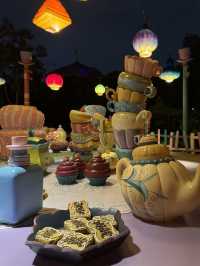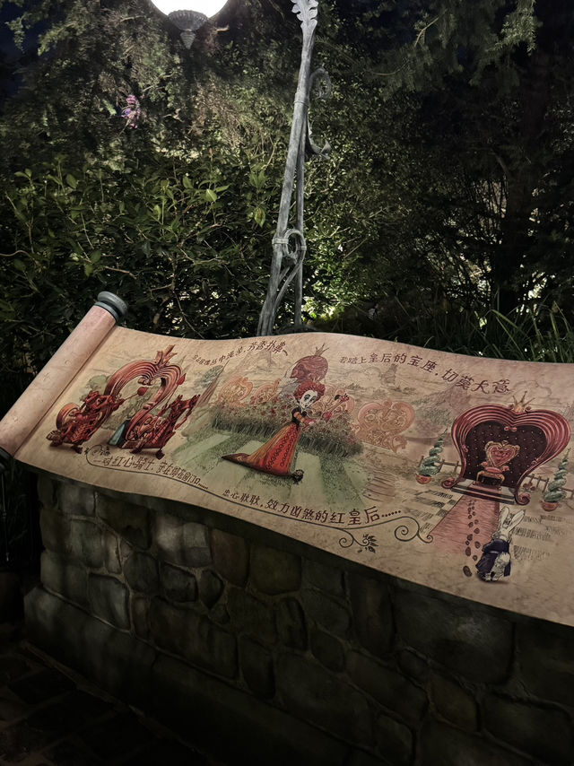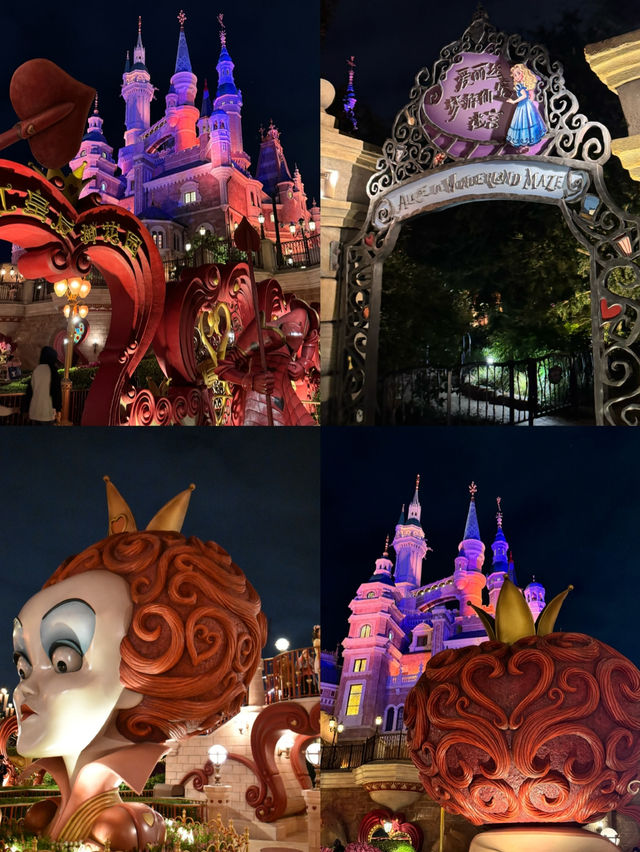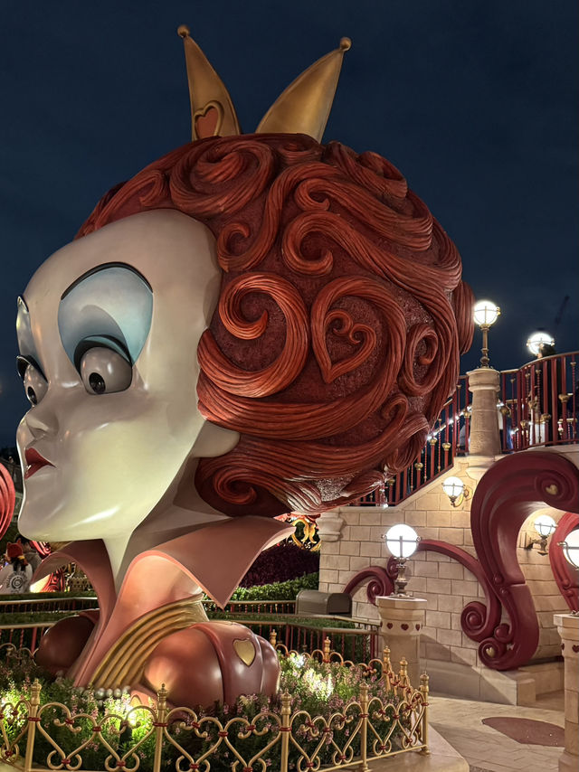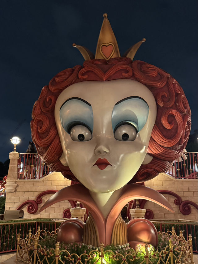 Shanghai Disneyland is highly recommended! Meet the Red Queen from the film! Alice in Wonderland Maze This maze, themed after Tim Burton's film Alice in Wonderland, features the Cheshire Cat, the White Rabbit, the Red Queen, and more. We recommend visiting at night when the lights are on. The Red Queen's Garden, with its expansive Red Queen garden and its striking red bulbous hair, makes for a popular photo spot! Once you've made it through the maze, you can enjoy a tea party. We actually got to sit down at a table lined with cookies and cupcakes. #0YenTravel2025Autumn #shanghai #ShanghaiDisney #Shanghai #ShanghaiTrip #ShanghaiDisneyland #Disneyland #shanghaidisney
