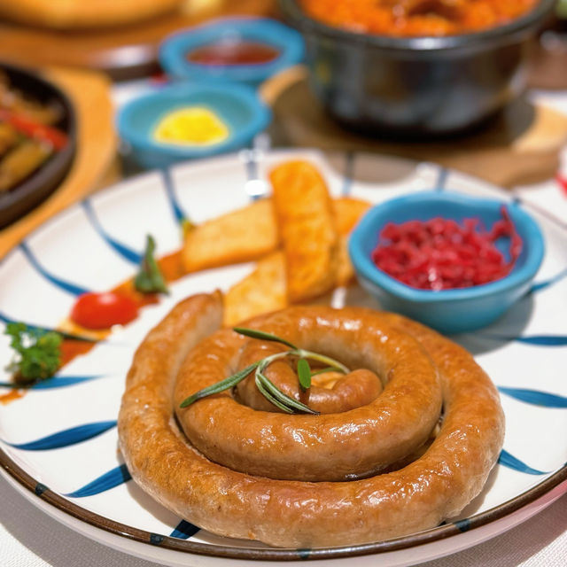 The menu generally follows the pattern of Western meal packages, starters, main courses, main courses, desserts, drinks, and wines, but the variety of dishes is very rich, a thick book. None of the three of us had any Russian food, we ordered dishes with "the name sounds very Russian". The staple of the Russians—whole wheat and rye romaine, half of the romaine sliced ​​thick and looser than I imagined Nut vegetable salad🥗 The nuts are pecans, filled with fruit, honeydew, red-fleshed dragon fruit, white-fleshed dragon fruit, strawberries and lots of vegetables💚 Russian canned rice, as the name suggests, is canned beef style rice, looks like a small can, but unexpectedly very deep, so the portion is actually very plentiful. Although the beef is large but very soft, beef bone broth boiled tomato beef brisket stewed rice, very rich, personally highly recommend must-choice dishes 💥 I ordered chicken skewers in the Russian specialty skewers. Three fist-sized pieces of grilled chicken, truly "big skewers". Be sure to eat it while it's hot, not seasoning with cumin commonly used in Northwest barbecue, the substitute spice flavor is paired with chili sauce, raw onion and pickled cucumber to relieve your thirst🤓 Moscow beet soup is a must, we have never had it, looking we thought it was sour, like borscht, but completely beyond our imagination, it was sweet, the soup contained beets, vegetables, potatoes, beef💮 Russian-style stir-fried chicken looks particularly like potato salad, but there are quite a few chicken diced hidden inside the mashed potatoes. Black pepper juicy squid For me it was fine, the teppanyaki was more tasty and the black pepper flavor was heavy Pan-fried Moscow disc sausage I admit it's especially like ball candy, but the taste is the least prominent compared to other dishes 😅 Russian cheese buns I didn't expect that not cheese can be stretched, rich cheese flavor, soft bread with slightly sweet 👍🏻 Because I have not been to Russia, can not detect whether the taste is authentic or not, the taste of the dish, the decoration environment and the attitude of the waiter, I am definitely giving full marks 💯 Address: G-2, G Floor, Royal Plaza West Plaza, 118 Fuhua 3rd Road 🚉 Line 1 or 4 Convention and Exhibition Center Station Exit C Business Hours: 11:00 AM - 21:30 PM Average consumption per person: 150 #RussianKitchen #RussianCuisine #ShenzhenRussia #Convention and Exhibition CenterStation #Royal Square #Moscow #Dai Chuan Li #Da Li Ba #Russian Can Stewed Rice #Russian Cheese Bun #Moscow Beet Soup #ShenzhenEatDrinkFun #Shenzhen Attractions #ShenzhenEatDrinkFun #ShenzhenFood #ShenzhenMustEat #ShenzhenStrategy