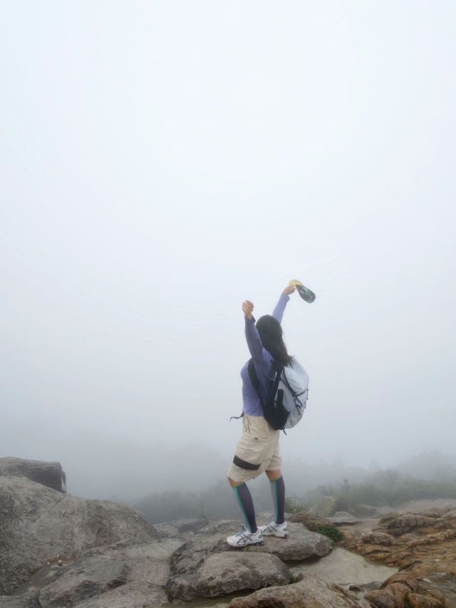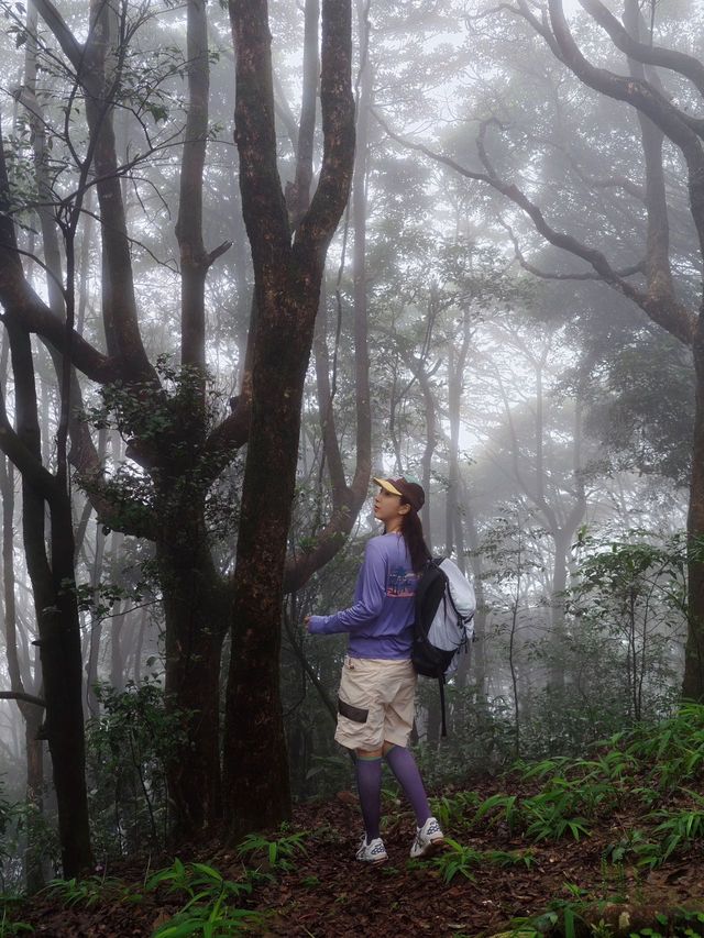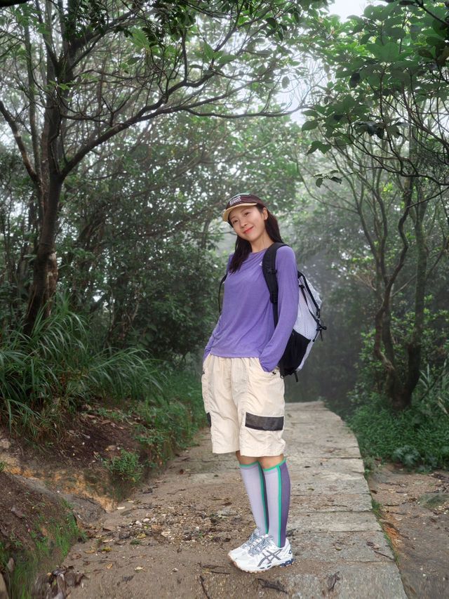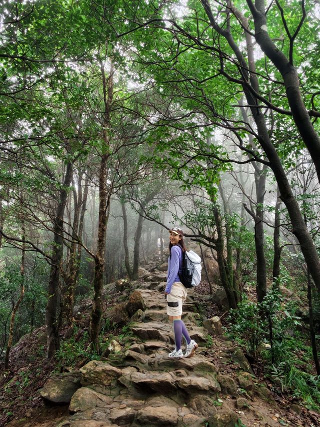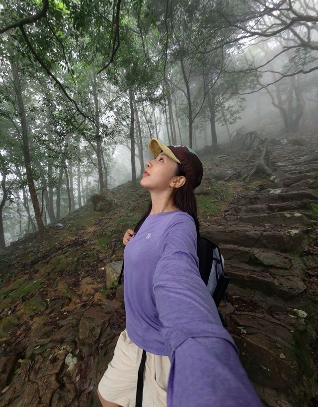 The happiness this weekend comes from Wutong Mountain. Even when encountering foggy weather, there’s no frustration about the clouds hiding the scenery, but rather joyfully blending into the atmosphere. Mist swirls among the trees ☁️ The sound of raindrops falling on the leaves, enjoying a healing hike in the rain. - 【Route Sharing】 🗺️ This time, I took the shortest route with friends ⛰️ Xiutong Trail (total length 2.14 km) 🧗 On Xiutong Trail — climb to the top of the highest peak in Pengcheng — descend via Bitong Trail (or return the same way, about the same) 🕒 The whole trip takes about 4 hours including walking and taking photos 🚇 Exit C of Shenzhen Foreign Languages High School, take the elevator to the 2nd floor to exit, then navigate to “Xiutong Hiking Trail” and walk 15 minutes to the trailhead 🥤 There are two supply points at the trail entrance and along the way up the mountain
