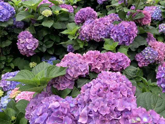 This spring feels quite different! I've been taking daily walks in Daan Forest Park, and recently I was astonished to discover a whole area of hydrangeas in full bloom. The gardeners are truly impressive—they worked tirelessly overnight to plant and arrange the flowers so quickly! According to the traditional saying about the blooming sequence: "Camellias and plum blossoms in January, cherry blossoms in February, azaleas and roses in March, hydrangeas and calla lilies in April, tung blossoms in May, golden shower trees and lilies in June, sunflowers, spike flowers, daylilies, and lotuses in July and August, chive flowers and silvergrass in September and October, and maple leaves and bald cypress in November and December." Due to global warming, this year's hydrangea season has arrived earlier. The vibrant colors of the hydrangeas are truly refreshing to behold. The next day, I brought my mom along to enjoy the flowers!