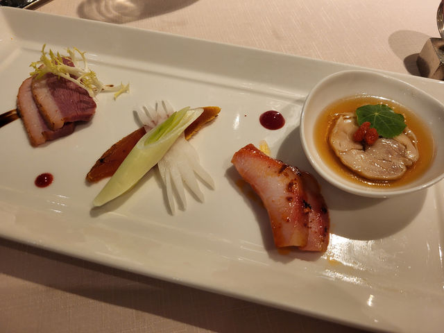 The Grand Hyatt Gala Dinner at the Grand Hyatt Taipei was a truly luxurious dining experience, meticulously curated, showcasing the culinary team's mastery of ingredients and creative interpretation. The appetizer, mullet roe with garlic sprouts, opened with a savory and refreshing flavor. The Huadiao chicken exuded a rich wine aroma and a smooth texture. The red oil-grilled matsuzaka offered a balanced spice and oiliness. The grape vinegar-glazed duck breast was a refreshing and appetizing combination of sweet and sour. The main courses followed one another, including the rich and nourishing broth of free-range chicken with ginseng, jujube, and bamboo shoots. The Jade Dry-Braised Sea Cucumber showcased the freshness of the ocean. The garlic-infused prawns with silver thread complemented the sweetness of the shrimp. The Port Wine-Roasted Wild Mushroom Beef Short Ribs were tender and richly layered. The fragrant truffle roe and preserved meat rice was a highlight. The apple custard tart concluded the meal with a sweet, sour, and crispy flavor. The entire dinner was not only diverse and exquisite, but also showcased the quality of an international five-star hotel, from appetizers to desserts, leaving a lasting impression. #Grand HyattTaipei #ConferenceDinner #TaipeiFood