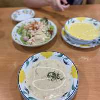 "Salia is not angry, she says it's a boon for the poor" But this saying is already in the old days, now things have been increased in price, but it does not stop you from making your own civilian western food 🍽✌🏽 Sweet Shrimp Salad🥗 (HKD 24): No deception, super many sweet shrimp, really eat fresh and sweet 😆 salad 🥗 vegetables fresh and crisp, and three tomatoes, plus Salia salad dressing, eat thousand island sauce, sweet and sour, great appetizers. Corn Cream Soup (HKD 12): Sweet corn🌽 is smooth in the mouth, plus the right amount of cream to increase the thickness and aroma, good 👍🏽 Weekly Seafood Soup (HKD 12): There are really grains of mussels, but the taste is relatively light, added a little vanilla 🌿 seasoning, and carrot grains to increase the taste, no HEA you. Garlic French Bread (HKD 10): Served hot and spicy, the French bread is not so hard that it kills people. Instead, the French bread is more skinny. The garlic butter🧈 is unbeatable, and it is toasted to crispy edges. Pasta with Cuttlefish Sauce (HKD 32): Every time I eat like a squid, black, but the pasta is seasoned plus olive oil and salty squid juice, surprisingly good, and smoky squid🦑, plenty of portion, delicious😋. American Ribeye Steak🥩 (HKD 68): The steak has a strong beef flavor, evenly distributed fat, surprisingly good, the meat is glutinous, the black pepper sauce is spicy, and there are sweet corn🌽 grains as a side dish. Salia Italian Restaurant (Tsuen Wan Plaza) (Tsun Wan)📍 Shop 203-208, 1/F, Tsuen Wan Plaza, 16 Tsuen Wah Street, Tsuen Wan #TsunWan #TsuenWai #Saria Italian Restaurant 🇮🇹 #Fresh Ingredients #Soda🥤 #Squid Sauce Pasta #American Ribeye Steak #Corn Cream Soup #LocalTour #foodie #SummerFoodRecommendations #Summer Good Places