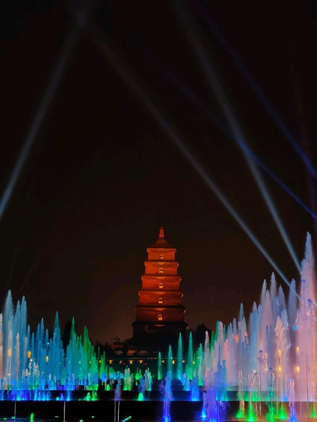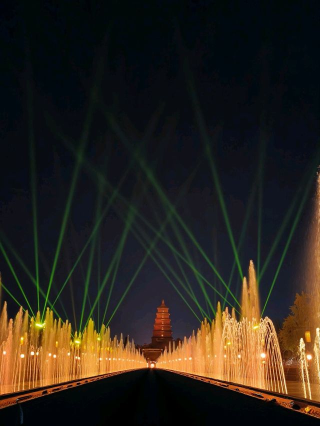 ✨Vibe & Experience: If you’re visiting Xi’an, this fountain show is one of those “you can’t miss it” kind of experiences. Set right in front of the iconic Big Wild Goose Pagoda, the whole square lights up when the music starts, it feels grand, lively, and just a little bit magical ✨ 🎶 Show Highlights: The fountains dance perfectly to the rhythm of traditional and modern music, with water jets shooting sky-high and lights changing in sync. It’s one of the largest musical fountains in Asia, and honestly, you can feel the energy of the crowd when the show begins. ⏰ Best Time to Visit: Go in the evening, the lights make the entire square come alive. The main show usually starts 12:00, 16:00, 19:00 and 21:00. Arrive 20–30 minutes early to grab a good viewing spot, especially near the center line facing the pagoda. 💡Tips: •Don’t stand too close unless you want a “free shower” 💦 •Bring a tripod if you want night shots, the reflections are beautiful. •The area gets crowded fast, so keep your belongings close. 🍢Nearby: There are tons of street snacks and shops around the square, try the barbecue skewers and biangbiang noodles after the show. Perfect way to end the night in Xi’an!