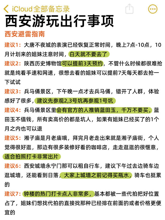 🔥Xi'an Travel Guide: 3 Days 2 Nights In-Depth Tour, No Pitfalls!🔥 💫Xi'an, a city that carries the history of thirteen ancient dynasties, where every brick seems to tell a thousand-year story. Want to explore Xi'an without falling into traps? This guide will unlock the right way to experience Xi'an! 📅 Itinerary: 🌈 Day 1: 🕍 Xi'an Bell Tower → Xi'an Drum Tower → Muslim Quarter: Feel the pulse of the ancient capital and taste authentic snacks. 📚 Shuyuanmen: Stroll through the cultural alleys and soak in the scholarly atmosphere. 🏯 Xi'an City Wall: Ride a bike or walk to enjoy the ancient city scenery. 🎨 Zhongda International: Check in at Xi'an’s fashion landmark and feel the modern charm of the ancient city. 🌈 Day 2: 🏛 Shaanxi History Museum: Book in advance to witness the true face of history. 🗼 Giant Wild Goose Pagoda: Climb the pagoda for a distant view and feel the glory of the Tang Dynasty. 🛍 Joy City: Shop and relax, and maybe spot the Monkey King statue. 🌃 Tang Paradise + Tang Dynasty Night City: Nighttime light shows and performances will transport you back to the flourishing Tang era. 🎶 Musical Fountain: Enjoy a feast for the eyes and ears. 🌈 Day 3: 🗿 Terracotta Warriors: A must-visit to feel the power of Emperor Qin Shi Huang. 🏞 Lishan Garden: Next to the Terracotta Warriors, where natural scenery meets historical relics. 🏯 Huaqing Palace: Explore the love story of Yang Guifei and Emperor Xuanzong of Tang. 🏔 Lishan Mountain: Climb high for breathtaking natural views. 🙏 Camel Bell Legend: Watch a stunning live performance to learn about the Silk Road story. 🍜 Food Recommendations: Chunfa Sheng (Nanyuanmen Branch): Gourd Head Paomo, a state-owned old brand with authentic taste! Aihua Kuda Mian: Biangbiang noodles served in a small iron basin, long and wide noodles with a chewy texture, topped with sauce and chili, full of flavor! Shan Shisan: Specialty shop with many flavors, authentic taste, a great choice for souvenirs! Lao Jin’s Egg and Vegetable Sandwich: Egg and vegetable sandwich with a taste beyond expectations, one bite will definitely amaze you! 💡 Tips: The performances at Tang Dynasty Night City run from 7 PM to 10 PM. Sisters planning to visit in October, pay attention to the time and avoid going during the day. Book the Shaanxi History Museum 3 days in advance; you need fast hands and internet speed! Visit the Terracotta Warriors site later in the afternoon to avoid crowds and have a better experience. You can rent a bike at Yongning Gate of Xi'an City Wall, ride while touring the wall, and even catch the sunset! 💖 Follow me to explore Xi'an without pitfalls and without wasting money!