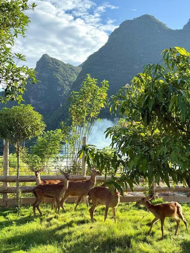 🦌 Encountering deer in Yangshuo! Melted by cuteness and unable to move in the Ten-Mile Gallery! Guilin's Little Switzerland! Cycling in the Ten-Mile Gallery and unexpectedly hit by the adorable deer attack 💘 The little spirits suddenly appearing among the overlapping mountains are just too cute to be fair! (Who understands the heart-fluttering feeling of being surrounded by a herd of deer rubbing against your hands!) 📍 Address: Ten-Mile Gallery Scenic Area, National Highway 321, Yangshuo County ⏰ Opening Hours: 24 hours of nonstop cuteness attack 📸 Perfect photo spots: 1️⃣ Lawn near the bamboo raft dock The favorite gathering place of the deer! Walking side by side with the deer and capturing their backs tells a great story (light-colored clothes recommended) 2️⃣ Reed beds by the Yulong River Chance to see deer lowering their heads to drink water! Backlit shots make their fur sparkle ✨ 🚲 Recommended activities: Rent an electric bike (30 RMB/day) to roam the gallery Along the way, you will pass: ✔️ Butterfly Spring (karst cave) ✔️ Moon Hill (natural cave shaped like a moon) ✔️ Big Banyan Tree (Liu Sanjie’s love tree) 🍜 Nearby food: Guai Ge Ding Pot Rice (clay pot chicken is a must-try!) Wangjianglou Restaurant & Bar (Lijiang beer fish + 180° viewing platform) 🦌 Feeding guide: Buy deer biscuits on site (5 RMB/bag) Remember to place the food in your palm and let the deer lick it~ (It really makes you scream when their wet tongues touch you!) ⚠️ Notes: - Deer appear mainly at dawn and dusk - Keep distance from mother deer with fawns - Wear non-slip shoes! The riverbank cobblestones are very slippery