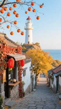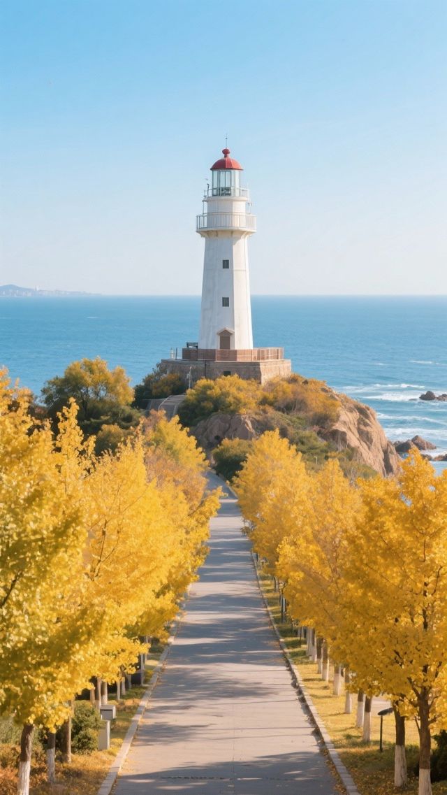 Yantai's Autumn Scenery at Its Best ~ Golden Tree-lined Road Meets the Lighthouse