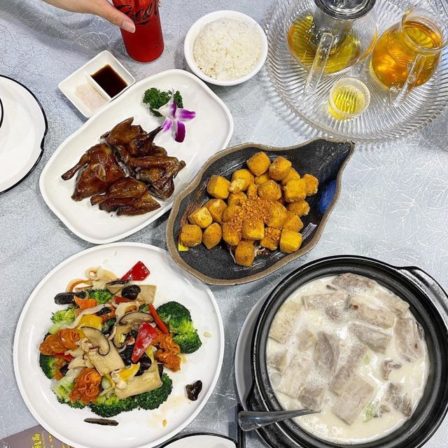Feng Mei Kitchen (Yuen Long) Shop A-B, 1/F, New Shun Fuk Centre, 12-18 Hong Yip South Street, Yuen Long Fried double mussels with broccoli $138 The broccoli is fried just right, not overcooked to eat crispy, there are also fresh and crispy coral mussels, elephant shrimp, stir-fried with XO sauce, fried very seasoned, spicy and delicious! Golden One Bite Tofu $98 A soft and tender tofu with a tender inner layer and a crispy outer layer, paired with slightly spicy seven-spice powder and fried garlic, brings a multi-layered mouthfeel and flavor, every bite is full of surprises. Duck pot with soybean oil $118 The weather is starting to turn cooler. It's best to eat the fragrant and warm lychee and taro oil duck pot. The whole pot is boiling and served. The taro is cooked pink and sweet. The oil duck meat is oily and has a pink color. It's great for serving rice. Braised Young Pigeon $68 The pigeon is big, the skin is crispy and the meat is fragrant, and the meat is seasoned through the bones. Put a little vinegar and pepper and salt together to eat, it's unbeatable! #foodguide #foodphotography#food tour