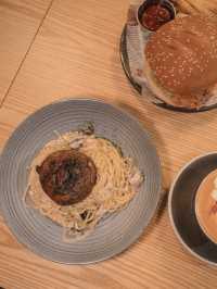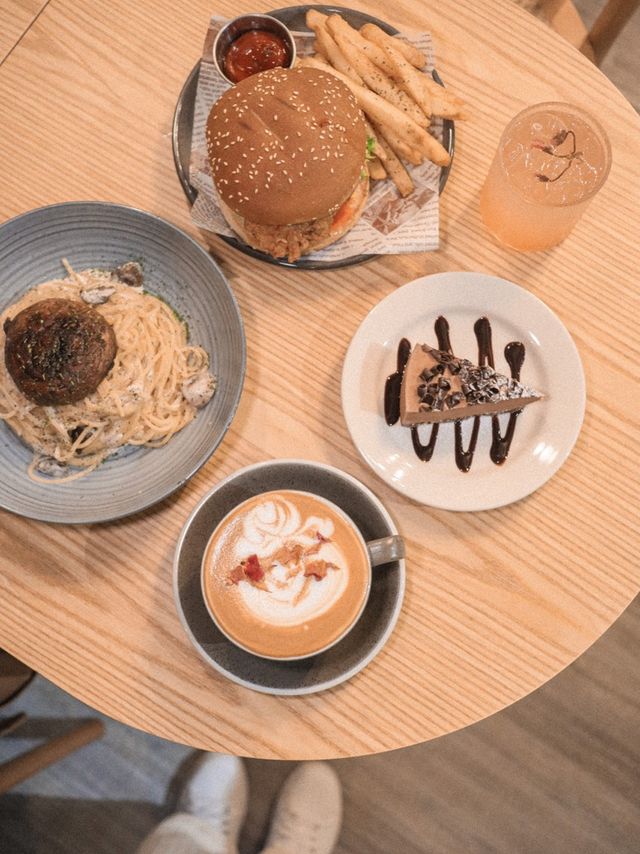 Just passed by and saw this newly opened cafe, there are outdoor and indoor locations, small fresh wooden decoration, when I went it was just six o'clock, it was not dark yet to take pictures😂 · The food is good value for money, most of them are less than $100. It is rare to see this price when you go to a cafe to eat 1️⃣ Black Truffle Brown Mushroom Cream Pasta ($76) Very fragrant black truffle flavor🤤🤤 The pasta is very juicy, each strip can be dipped in black truffle cream, the brown mushrooms are also very juicy, will not be cooked dry · 2️⃣ Spicy Cheese Fried Chicken Burger with French Fries ($78) Burger is very thick, the fried chicken is crispy on the outside and soft on the inside, the meat is tender and juicy, large pieces, every bite can eat the fried chicken😚😚 The middle also added a secret spicy sauce, the back is very strong😆 · 3️⃣樱花玫瑰荔枝滋补品($48) With a touch of rose plus a lychee flavor, this pairing is quite fresh and moderately sweet · 4️⃣Rosè焦糖拿铁($45) The latte art is beautiful, plus the rose petals are even more beautiful 😍😍 Latte more milk and less coffee, so the milk taste is stronger, easier to enter · 5️⃣ 巧克力芝士蛋糕($38) The chocolate flavor is prominent, the taste is very smooth, and chocolate sauce is added under the cake, which makes the visual effect even more beautiful😝 ………………………… Rating (5 points maximum) Taste: 🌕🌕🌕🌕🌗 CP value: 🌕🌕🌕🌕🌗 Environment: 🌕🌕🌕🌕🌗 Service: 🌕🌕🌕🌕🌗 ………………………… Ah Gui Coffee @ahgwaicafe 📍Shop 9, G/F, Tsui Wah Building, 9 Tai Fung Street, Yuen Long ………………………… #hkfoodblogger #hongkonggoodplaces #hkfood #foodie #localtour #cafe #summerfoodrecommendations #hkfoodie #hongkongfood #food