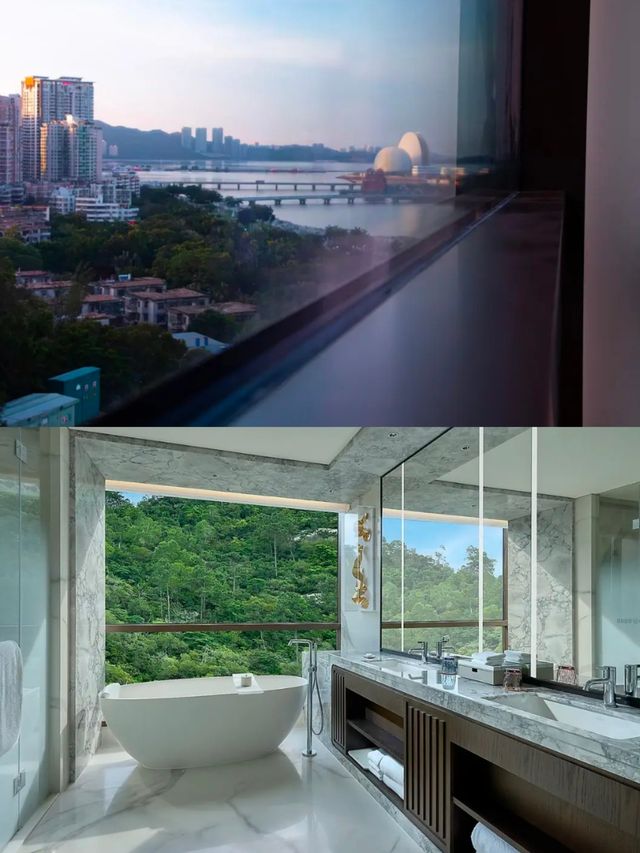 The most beautiful sea-view hotel I've found in Zhuhai so far. This prime coastal hotel offers stunning sea views every second! When you come to Zhuhai, you must spend two nights at this hotel! The location is absolutely fantastic! ☑Embraced by the Zhuhai Opera House on the left and Zhuhai Fisher Girl on the right! You can see the Zhuhai Opera House from your room. Nearby is Jingshan Sightseeing Cableway, and right downstairs is Xianglu Bay Beach! It's super close to Yang Pao'an Square, Zhuhai Love Post Office, and Haibin Park! The sea-view rooms come with a balcony, offering an incredibly expansive view. You can lie in bed and see the Zhuhai Opera House and the Hong Kong-Zhuhai-Macao Bridge. There's a separate walk-in closet, a bathtub with Acqua di Parma toiletries. They also thoughtfully provided welcome fruits and prepared children's toiletries, bathrobes, a safe, and a mini-bar – everything you need! Even the bathrobes are skin-friendly Egyptian cotton. The hotel facilities are very comprehensive. It has its own children's playground and an exclusive passage directly to the beach for sand digging. You can let the kids burn off energy all day without leaving the hotel! I highly recommend the sea-view infinity pool; the scenery is absolutely stunning! The changing rooms and showers are a thoughtful touch! The morning tea shrimp dumplings and red rice rolls are steamed to order, paired with a pot of Monk Fruit Chrysanthemum tea – so relaxing. Downstairs is Lovers' Road, and it's a 5-minute walk to the lighthouse.!! The bar on the 20th floor has a telescope, but you can't see the Hong Kong-Zhuhai-Macao Bridge very clearly!