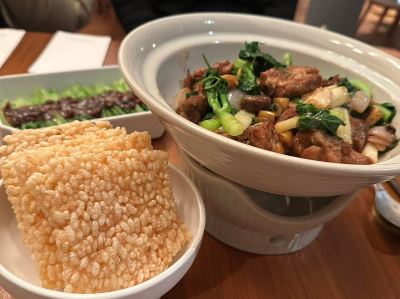 The holiday is about to end. I chose to eat at the more distinctive Langqiao in Chengdu. The entrance is quite stunning. I like the ancient architecture. Once you go up, the front desk will lead you into the restaurant. It has a long and nice feeling. The decoration of the tables and chairs inside is mainly in natural wood color. About food: Three cold dishes: "Cold Cordyceps Flower", Chili Abalone, Cold Ox Tongue: Not much, the presentation is beautiful, the taste is average, the cordyceps has been fried and is a bit too greasy. Suitable for pre-meal "Spicy Glutinous Rice Crispy Duck" Glutinous rice and crispy duck on the surface are soft and sticky, without the texture of crispy duck "Spicy Stone Pot Bamboo Shell Fish" Chop pepper, cut bamboo shoots into cubes, and sprinkle chopped green onions on the surface, which covers the freshness of the fish itself. The taste is average, and the fish meat is very broken, not surprising. "Fragrant Crispy Pigeon" The pigeon was overcooked, very dry and oily Pepper, Clam and Loofah The color is beautiful, green and refreshing, the taste is light and refreshing, the price is not proportional to the taste "Warm Tofu Almond Tea" Very ordinary, no special features, single taste Summary: A very ordinary restaurant, the environment is also very ordinary, there is no sense of luxury, the food is mainly creative, but I can't see any surprises, as for the taste, it's hard to describe, it's better to have a hot pot.