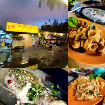 I didn't go to the Zhenlang Garden Seafood Restaurant that is popular among tourists online, because I heard from friends who have been there that the price is expensive. The Wonderland Food Store in Kuah Town is half the price. It just so happens that this restaurant is on the road where we walked out of the hotel where we stayed, Bella Vista Waterfront Resort & Spa Langkawi. It is cost-effective and the taste is good, so we had dinner here for two consecutive nights. It is closed at noon and only opens at night. Every night when I came, it was crowded with people. In addition to tourists, there were also locals eating here. We also waited for a while before we had a seat. There are Chinese waiters, so communication is not a problem. The menu here is much more affordable than the restaurant in the morning. Stir-fried clams with ginger and scallions, slightly spicy, fresh, more flavorful, and without mud and sand. Oyster omelette, not too many oysters, good with rice. Crispy fried shrimps, the shrimps here are priced according to grams, 100 grams for RM8. We ordered 300 grams, a total of RM24, the shrimps are relatively fresh, crispy and refreshing. Crispy fried cuttlefish, the deep-frying method feels a bit hot and dry, and it tastes a bit chewy. It would be better if there was some sauce. Sour plum chicken, very strange taste, not like the sourness of sour plum sauce, the chicken is not tender enough, and it is not recommended to order meat dishes here. Stir-fried small kale, different from the kale here, the leaves are more refreshing and slightly bitter. Seafood fried rice, the fried rice here is still very good, with plenty of ingredients, large portion, and good taste.
