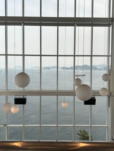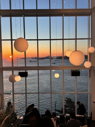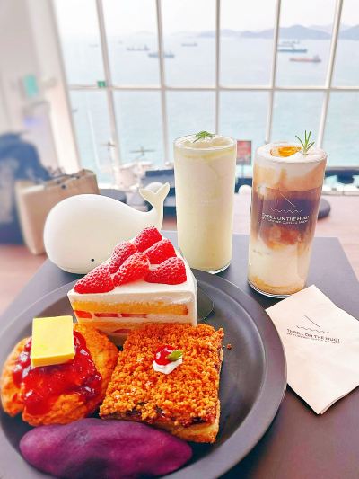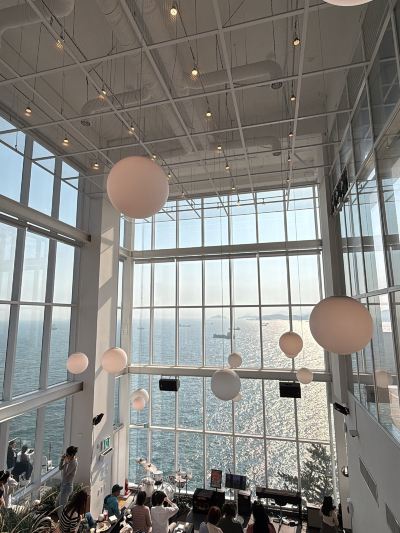 Located in a remote part of Yeongdo Island, near Taejongdae. There aren't many bus stops nearby 🚏 (it's a very long walk and uphill). Perhaps save your legs for shopping? I suggest taking the bus directly. You can combine it with the Shirakami Cultural Village. I love both places 😊 Upon getting off the bus, there's a large four-story cafe. Because it's located on the hillside, the entrance is directly on the third floor. After choosing a seat, go to the second floor to order. There's a whole row of desserts/breads 🥖, and the menus are in English. Unfortunately, we arrived late in the afternoon, and there weren't many left. But thankfully, the remaining strawberry jam cream scones were good. The bread wasn't too dry, and the cream paired with the slightly sour strawberry jam wasn't too greasy. The only downside was that I spilled some on the floor. The latte was normal; I should have ordered an iced Americano? Back on the third floor, it's absolutely stunning! Three entire walls are adorned with floor-to-ceiling windows. The tiered seating offers unobstructed ocean views from every level. This view completely blows away any other cafe with a small window overlooking the sea. The outdoor seating is incredibly close to the ocean; it's practically like being right on the water! On a sunny day, every corner is perfect for photos. In the afternoon, the sea sparkles beautifully. And in the evening, there's live jazz music, creating a truly atmospheric ambiance with the sunset 🌇. In short, I love this cafe so much! I can easily find myself lingering there for ages 😭