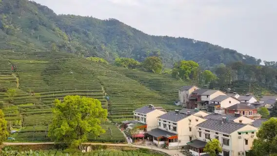 A thousand-acre scenic tea plantation in the core production area of West Lake Longjing, featuring century-old Longjing tea trees and camphor trees, with terraced tea fields.