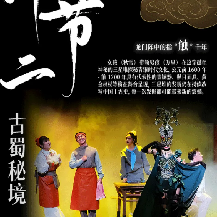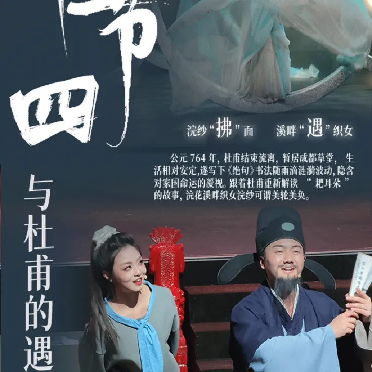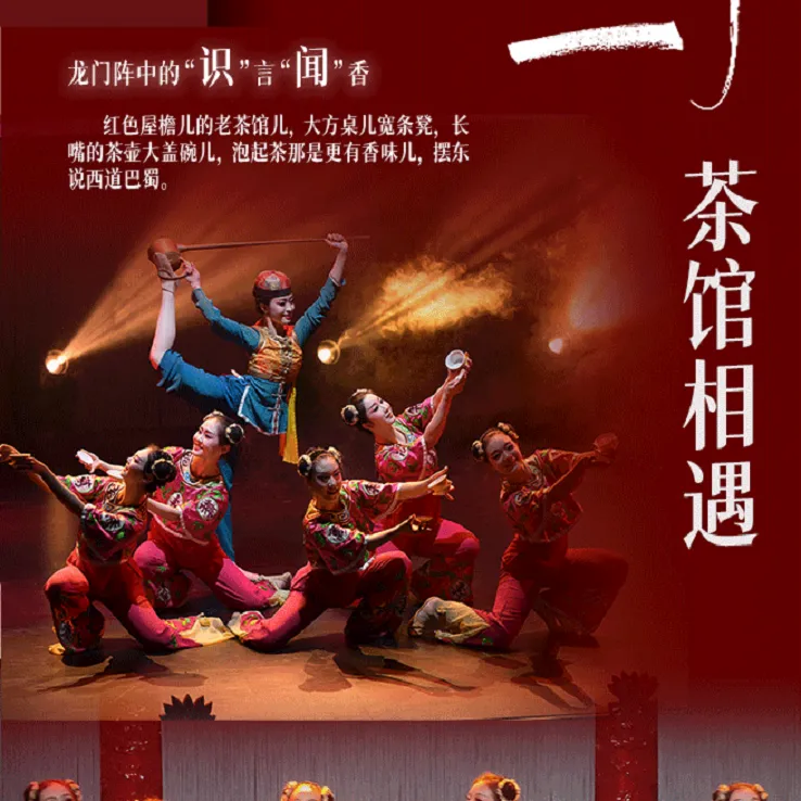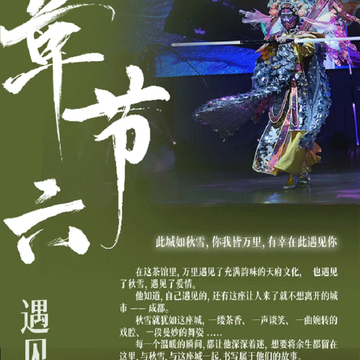 Show Introduction: "Encountering Tianfu" Next to Kuanzhai Alley and People's Park in Shaocheng Shijing, there stands a magical old red teahouse with extraordinary charm. In Chengdu, people call chatting in teahouses "spinning yarns," but this red teahouse is special—it serves as a gateway to an enchanting journey exploring Chengdu's heritage. From the Sanxingdui ruins to Jinsha relics, from the poet Du Fu to local officials, the experience blends the mystique of Duck River with the splendor of the ancient Shu Kingdom. It contrasts the refined elegance of the Tang Dynasty with the rustic charm of the Republican era. Audiences will follow the protagonists through time, savoring tea, inhaling fragrances, listening to melodies, and witnessing dance.